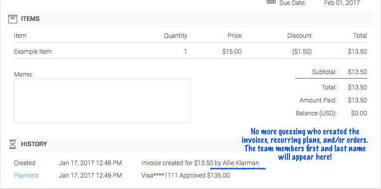 The team member first and last name can now be seen within the history events on Invoices, Recurring Plans, and even Orders (orders are found within the Retail app).