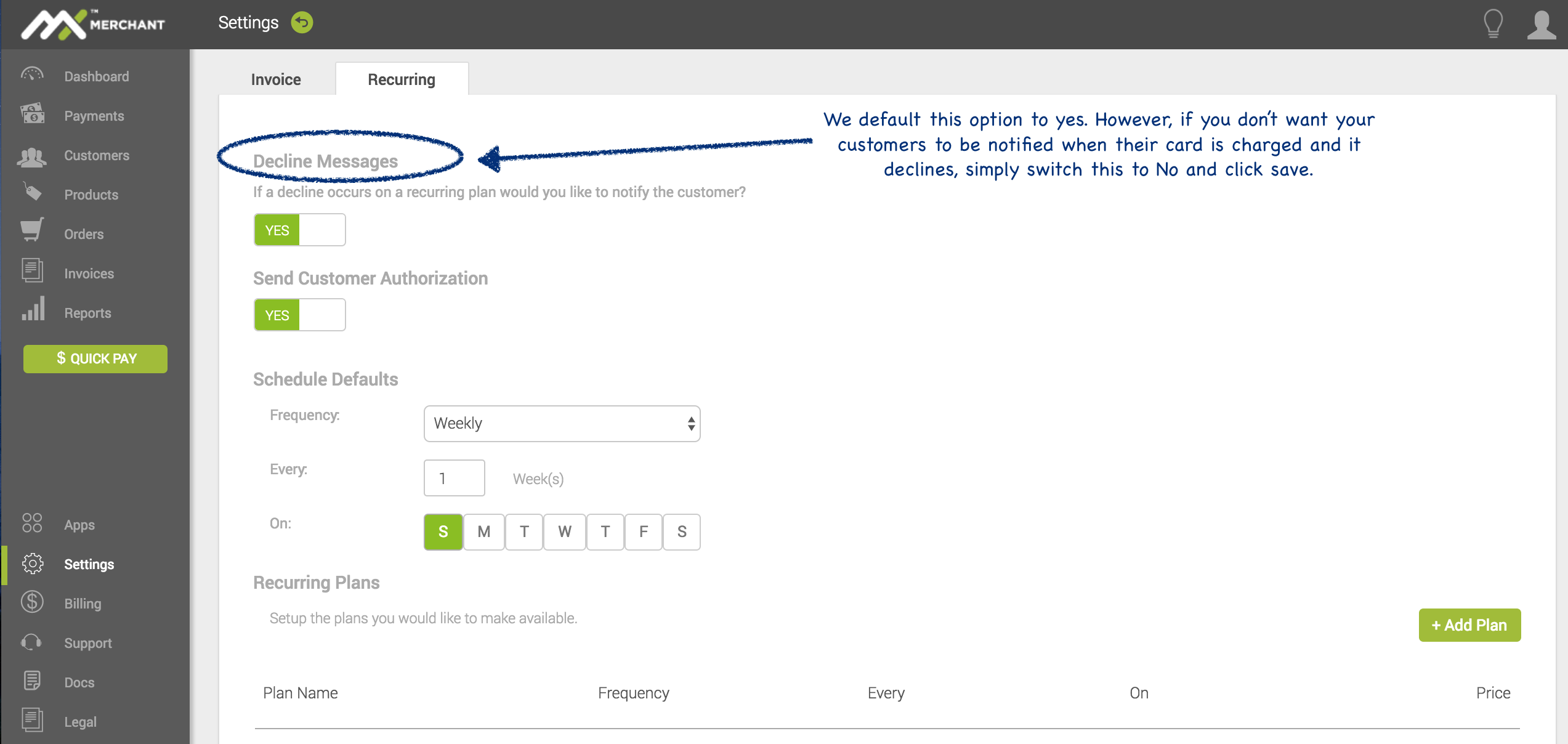 Decline notifications were one of those you asked for. If you don't want your customers to see these messages simply go to Settings, click on the Invoice tile, across the top select Recurring. Here you will see the first option available is for decline messages. It is defaulted to Yes, however, you can change that at any time to No and it will immediately stop sending them to your recurring customers.