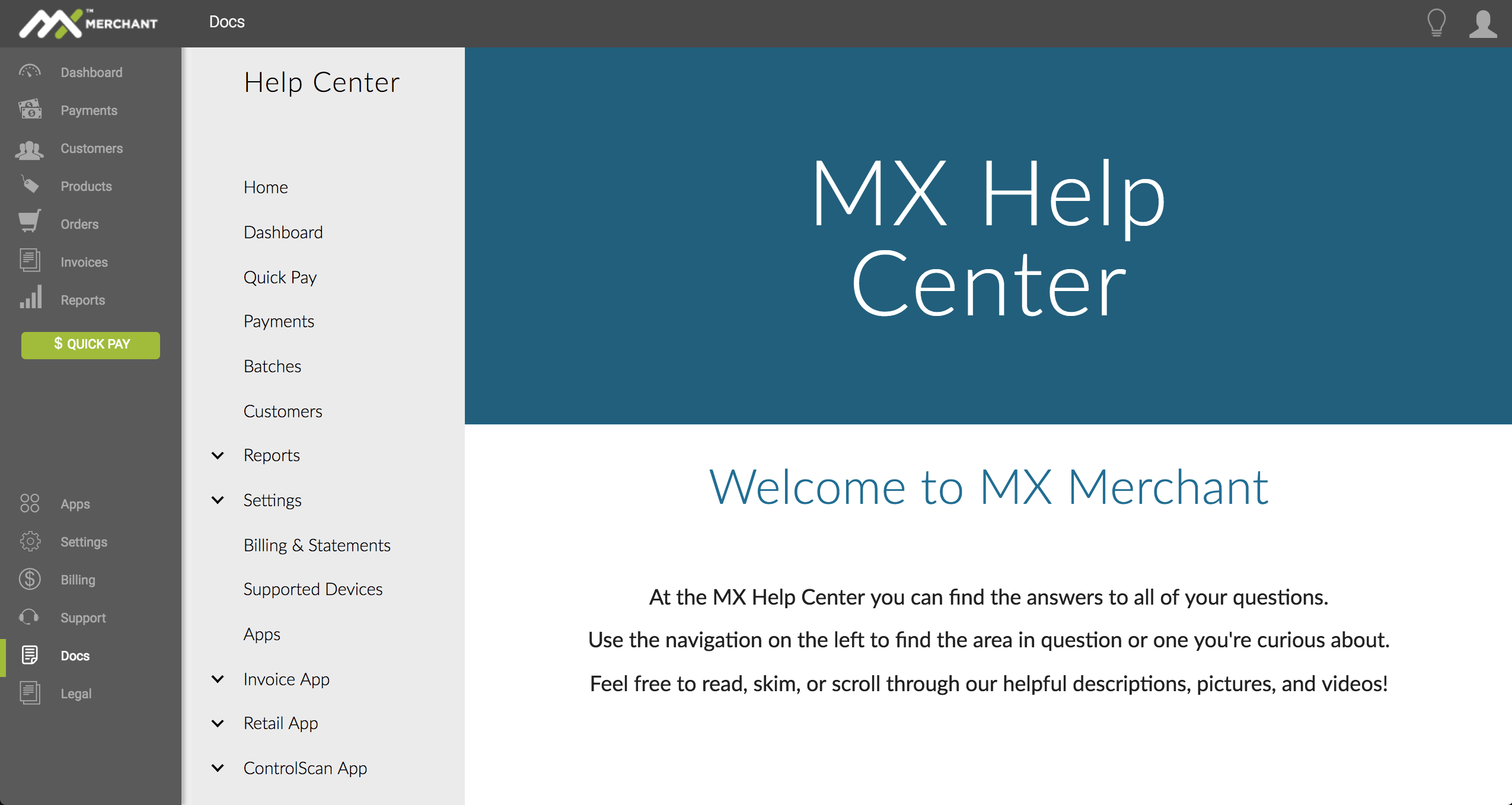 Make sure to check out our new doc site, it is so much easier to navigate! The navigation allows you to quickly find the section you are looking for and it even includes pictures and videos! Use the gray navigation bar to locate the area of MX Merchant you have questions regarding and see how quickly you find your answer!