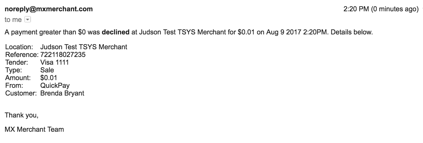 If a merchant subscribes for text or email notifications, when a transaction is performed by a customer in MXMerchant it would be great to have the customer name in the notification alert on text and / or email.