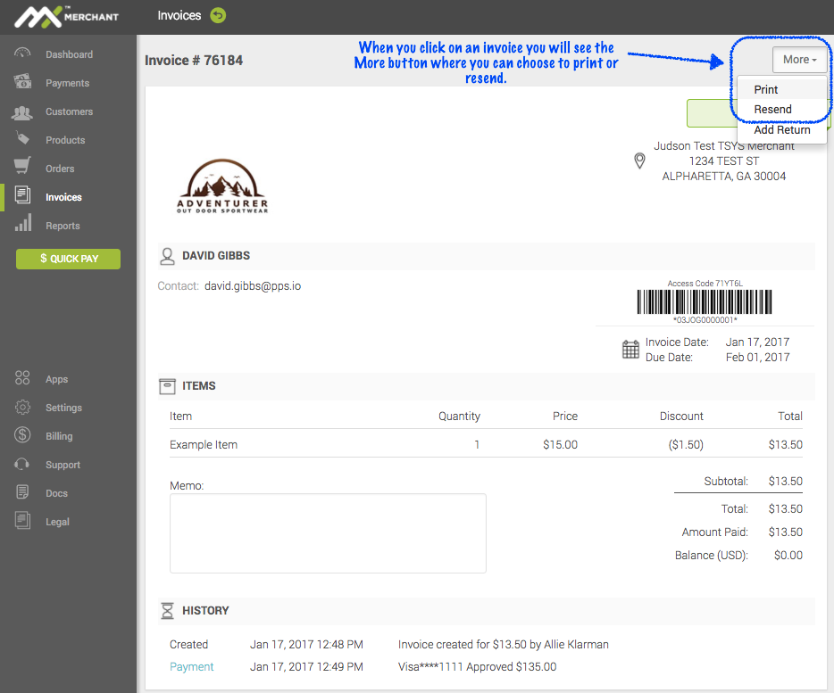 Another option is to click the Resend option under the more button rather than the Print. When you click Resend, it will allow you to select the email address for the customer which will send them a link to the invoice so they can print or save it themselves.