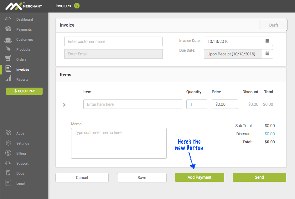 Don't believe us... go try yourself! Log into mxmerchant.com, go to invoices on the left hand menu, click the green Add Invoice button, and check out the new button on the bottom that says "Add Payment" It's magical!